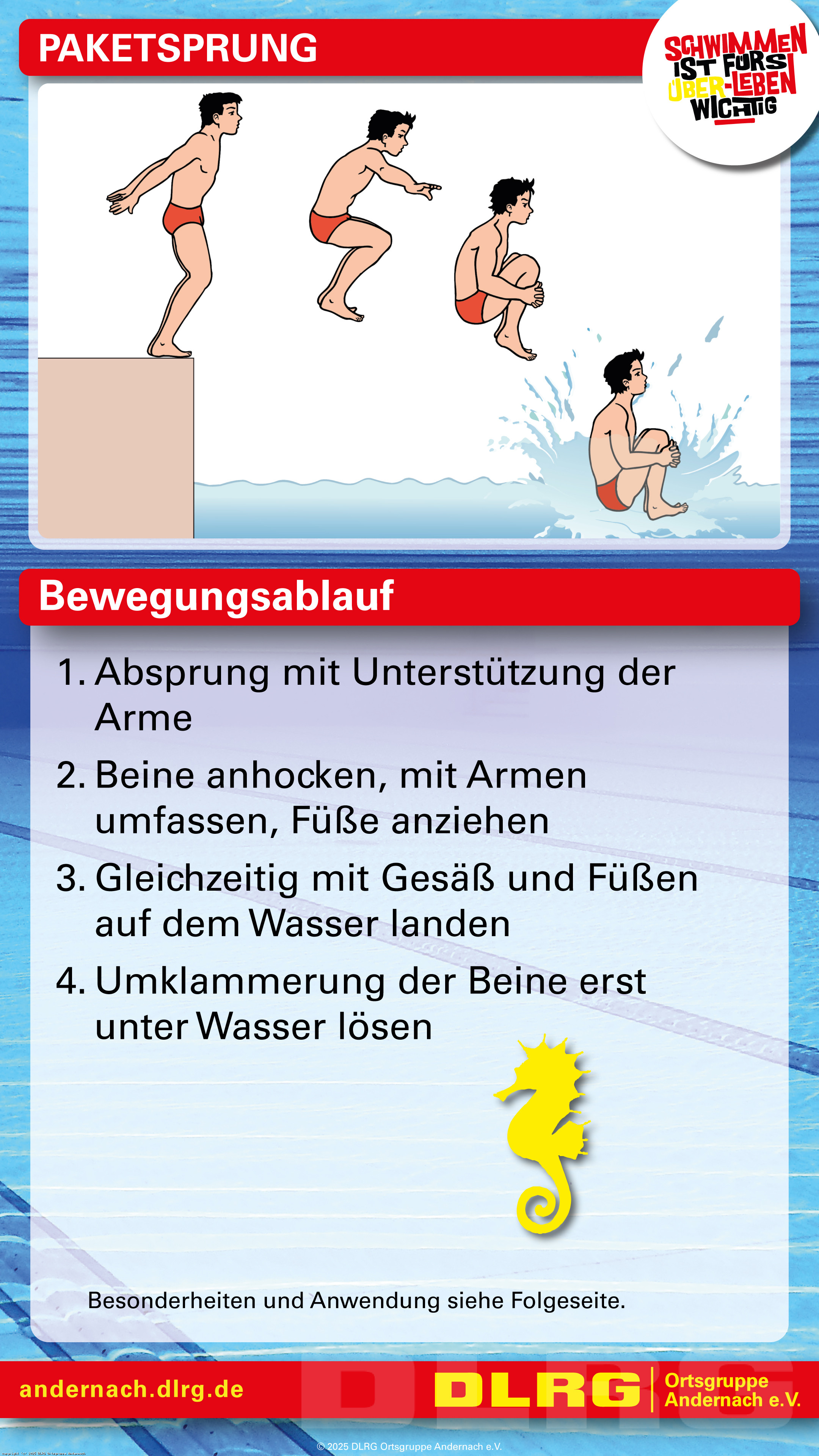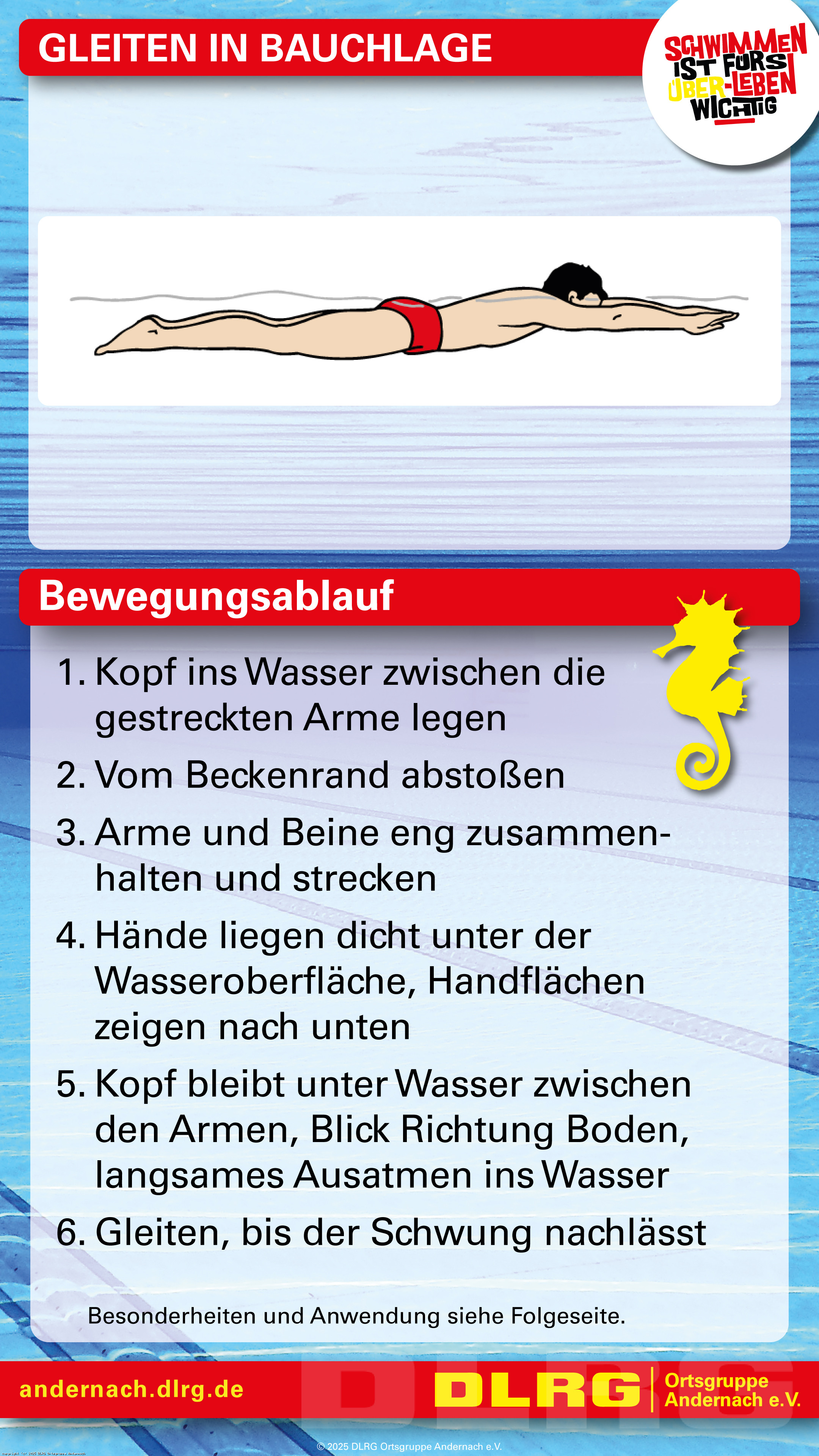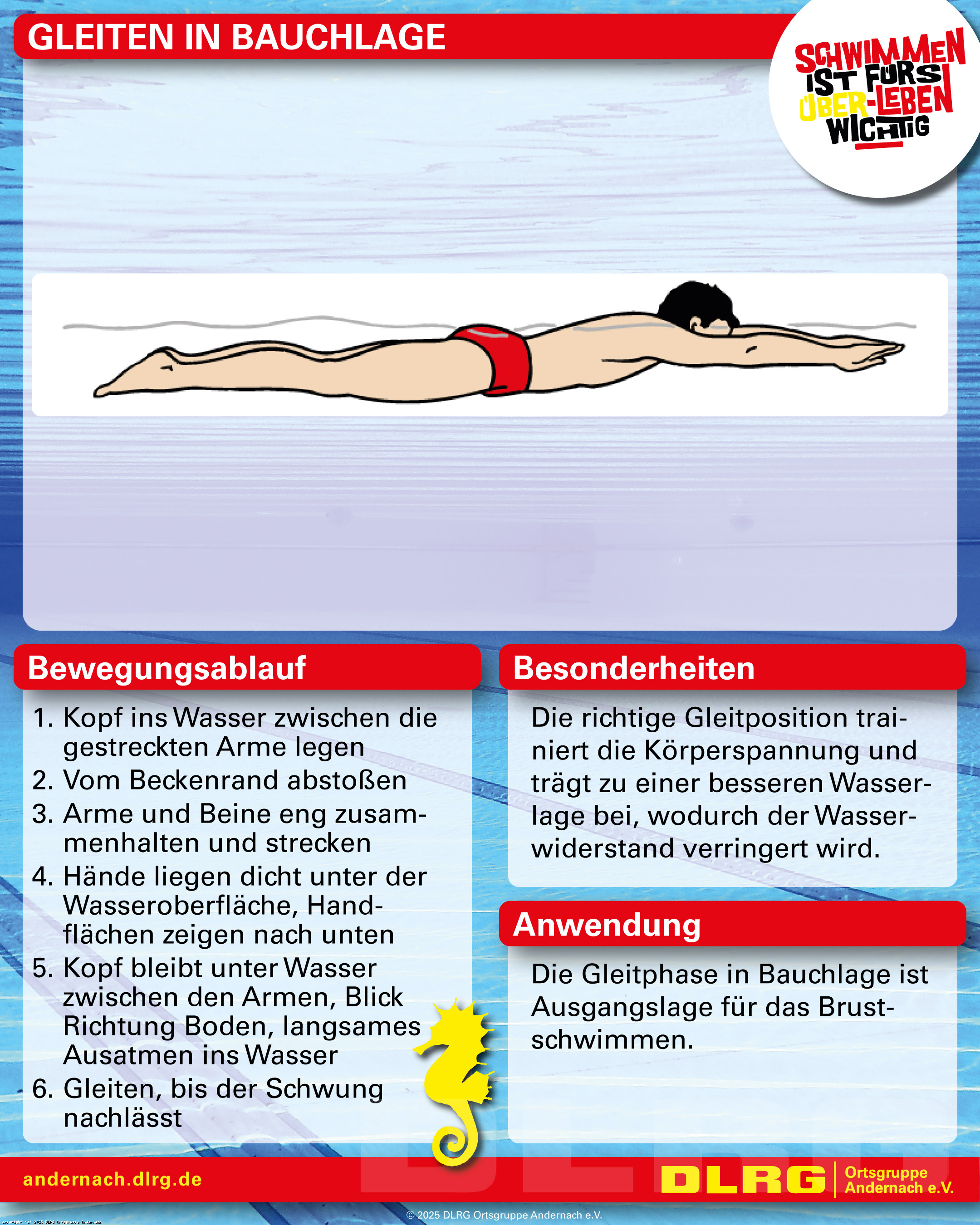 Mit speziell erstellten Spickzetteln können die Trainingskinder gemeinsam mit ihren Eltern auch außerhalb des Schwimmtrainings an den wesentlichen Grundlagen ihrer Schwimm-, Tauch- und Sprungtechnik arbeiten. Neben Bewegungsabläufen in Bild und Schrift sind auf den Spickzetteln auch Besonderheiten und Anwendungsgebiete zu finden: