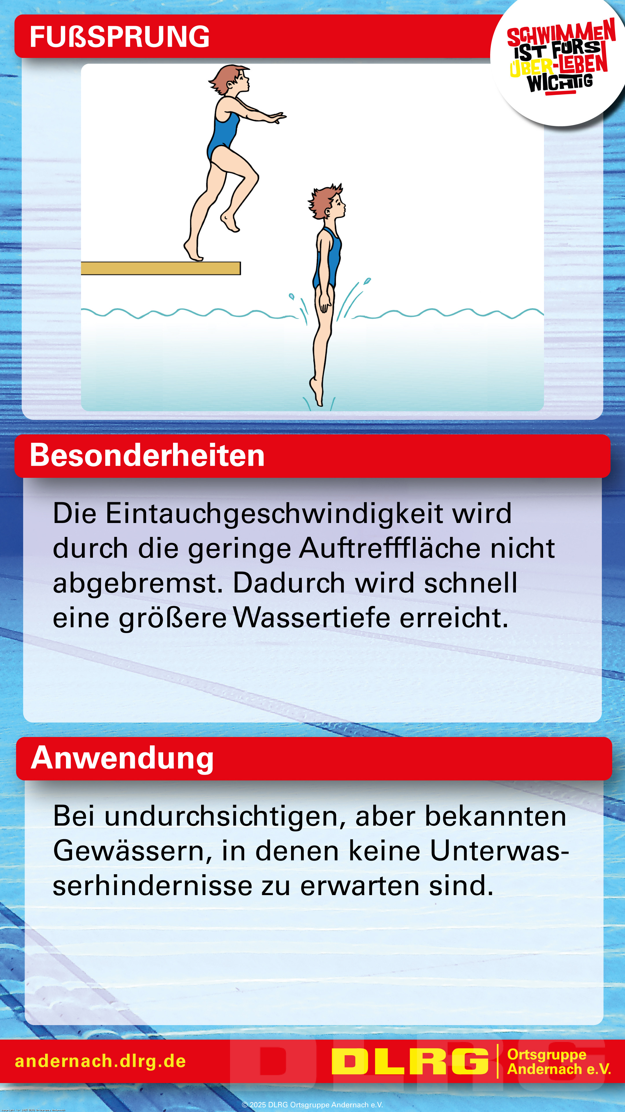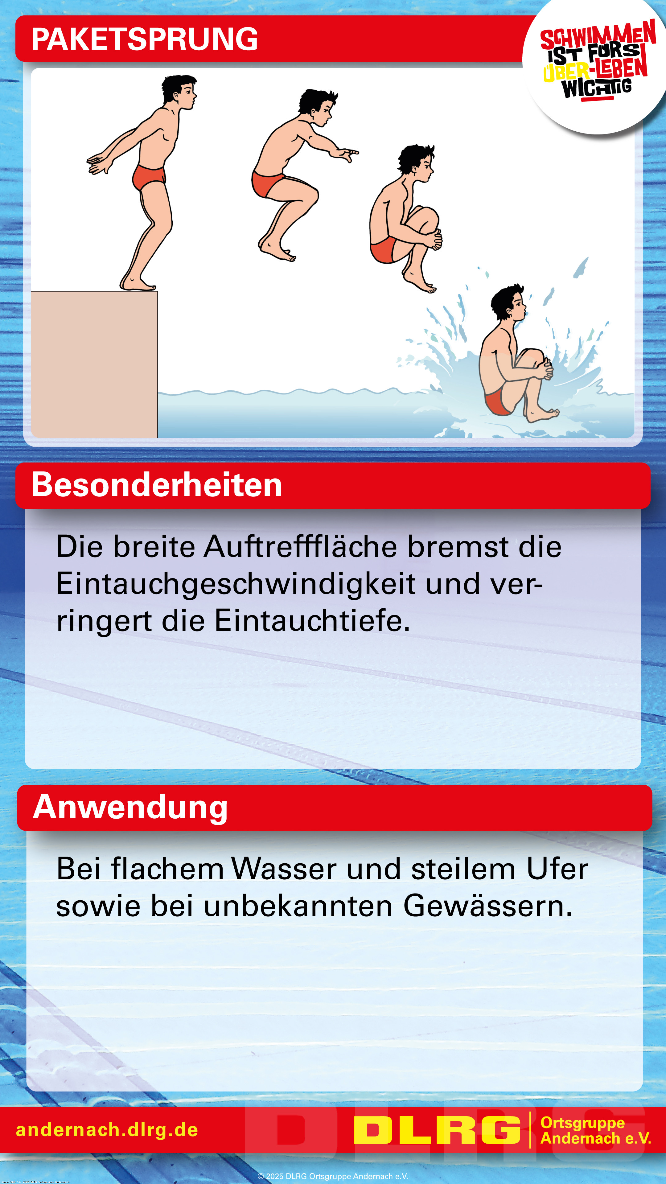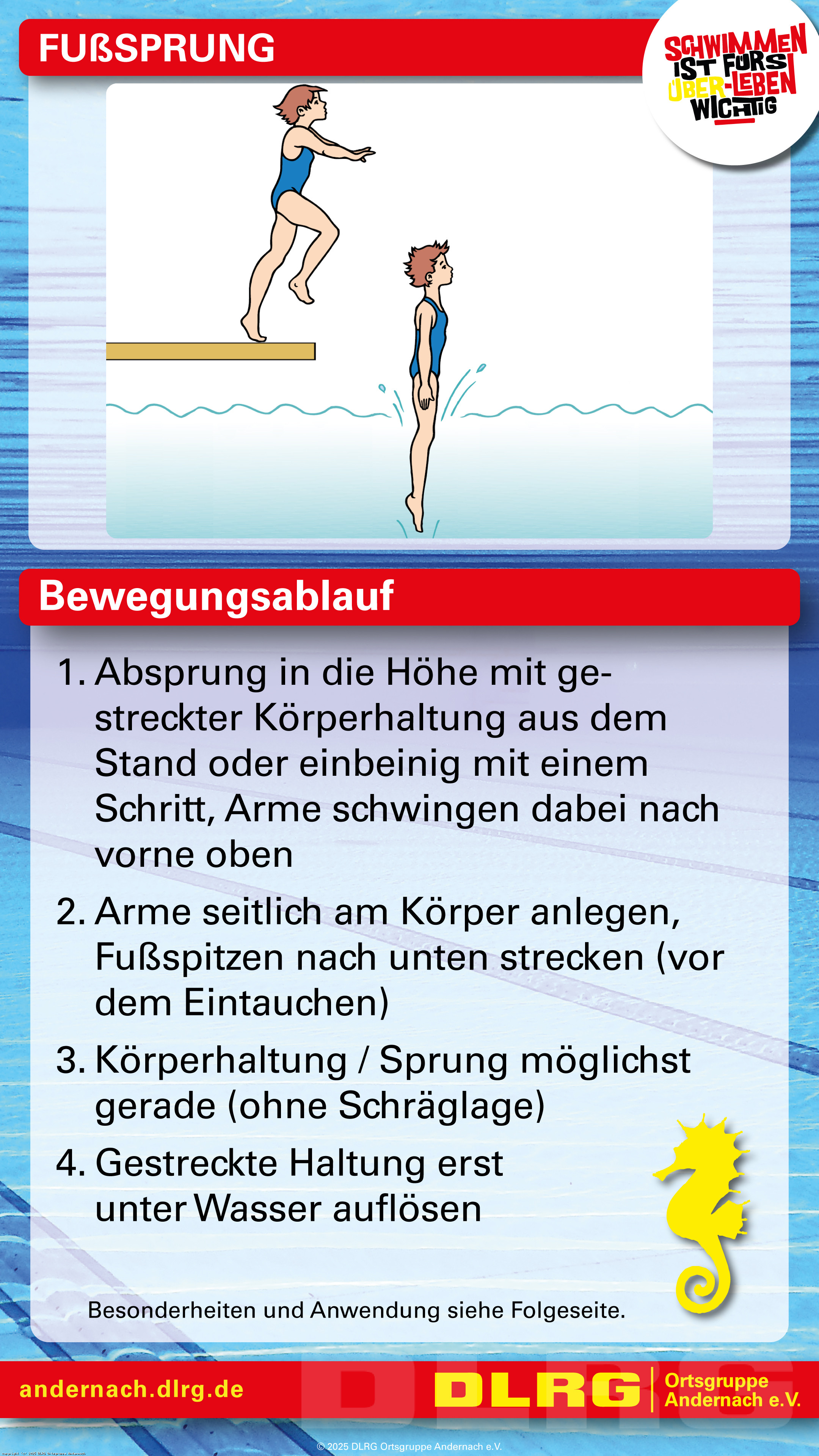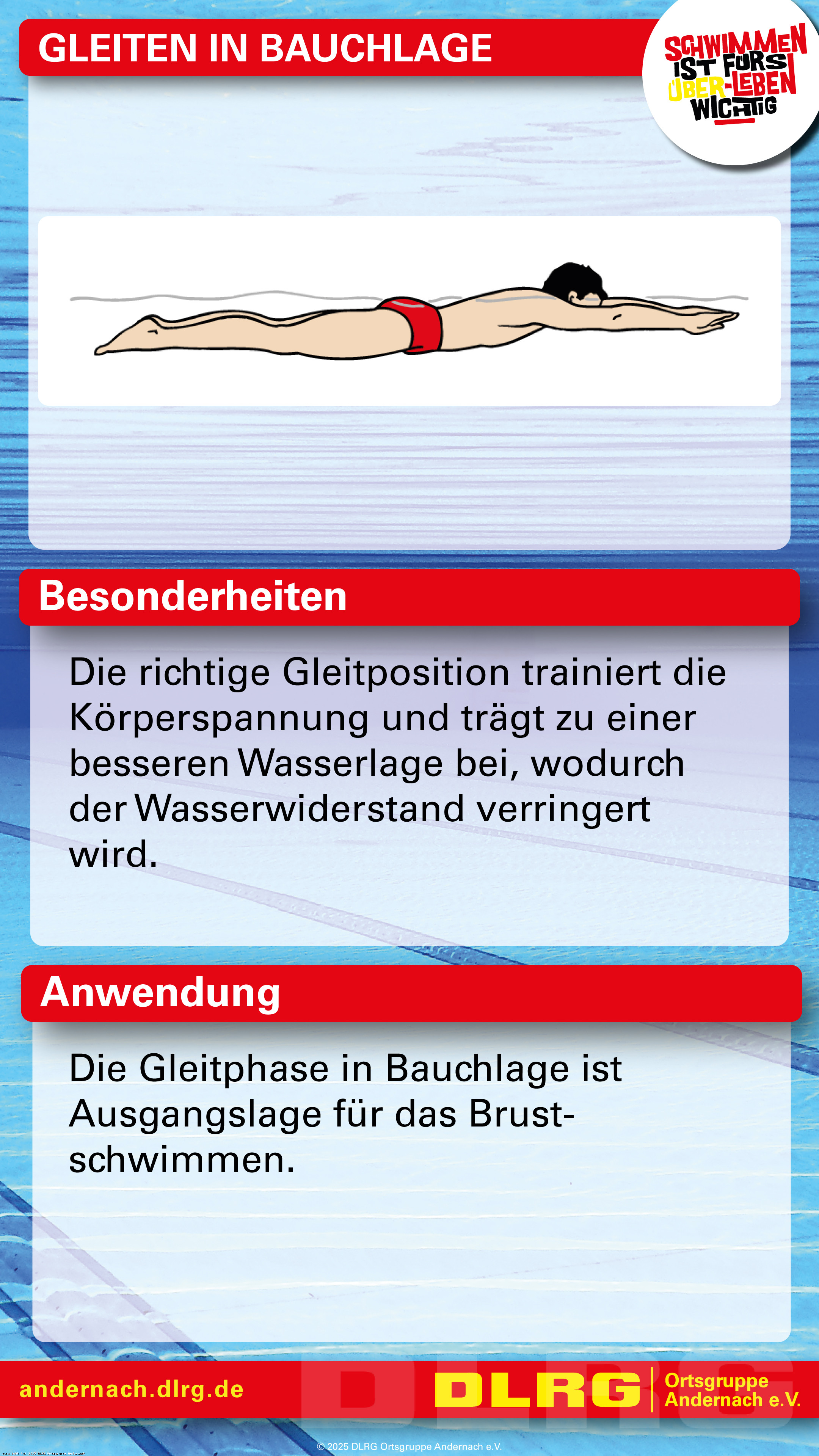 Mit speziell erstellten Spickzetteln können die Trainingskinder gemeinsam mit ihren Eltern auch außerhalb des Schwimmtrainings an den wesentlichen Grundlagen ihrer Schwimm-, Tauch- und Sprungtechnik arbeiten. Neben Bewegungsabläufen in Bild und Schrift sind auf den Spickzetteln auch Besonderheiten und Anwendungsgebiete zu finden: